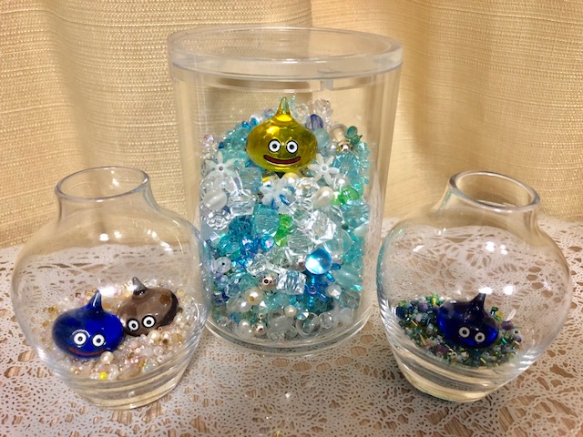 懐かしくて、可愛いので、ビーズと一緒に、アクリルの入れ物やガラスの小さなビンに入れて部屋に飾ってみました。